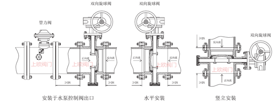 7)無論臥式安裝或立式安裝,當無法確定流道方向時,閥門打開時,蝶閥為大面端頭朝向進水方向;